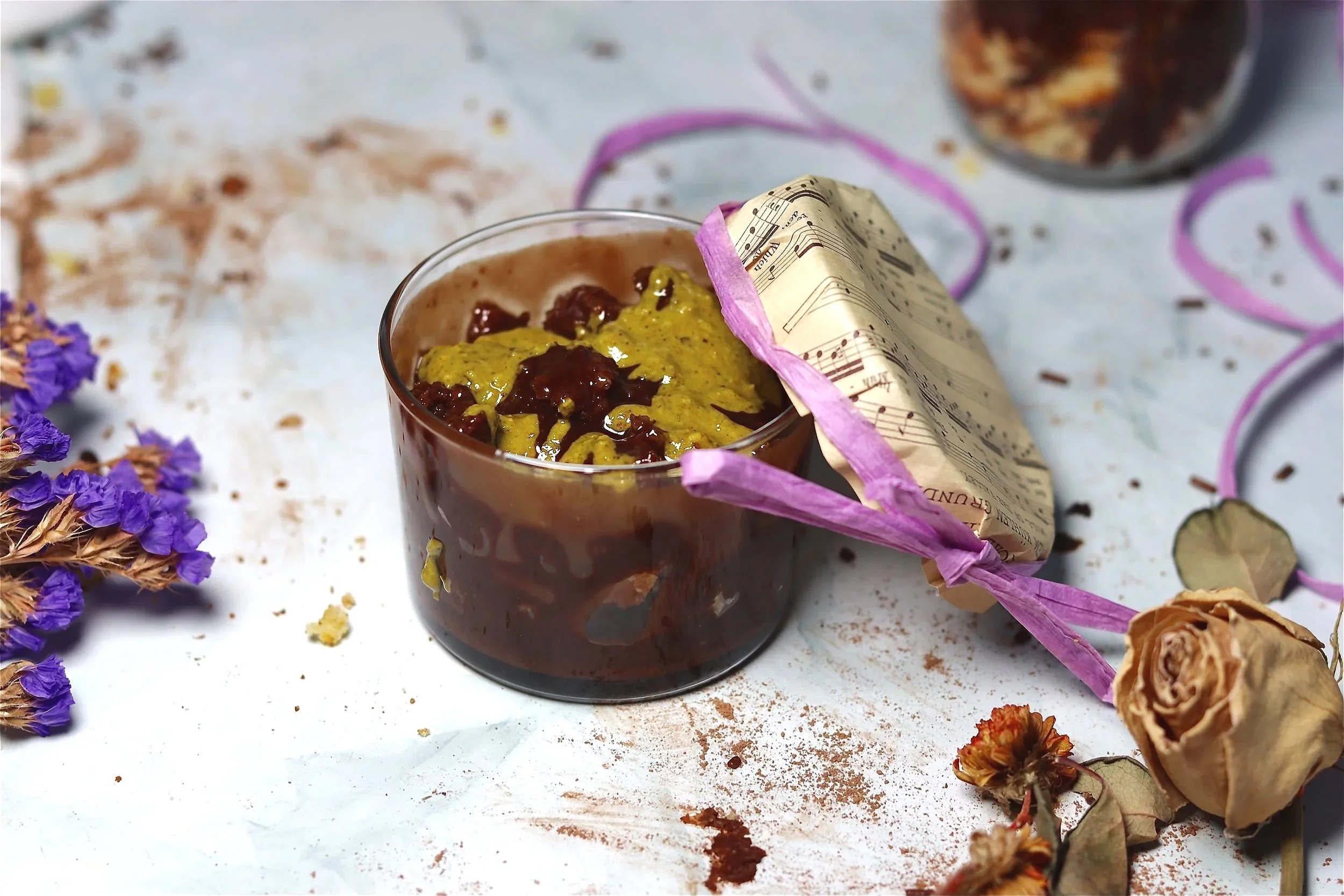 Pour chocolate sauce over the cake. Scoop 2-3 spoonfuls of pistachio paste over the chocolate sauce.
