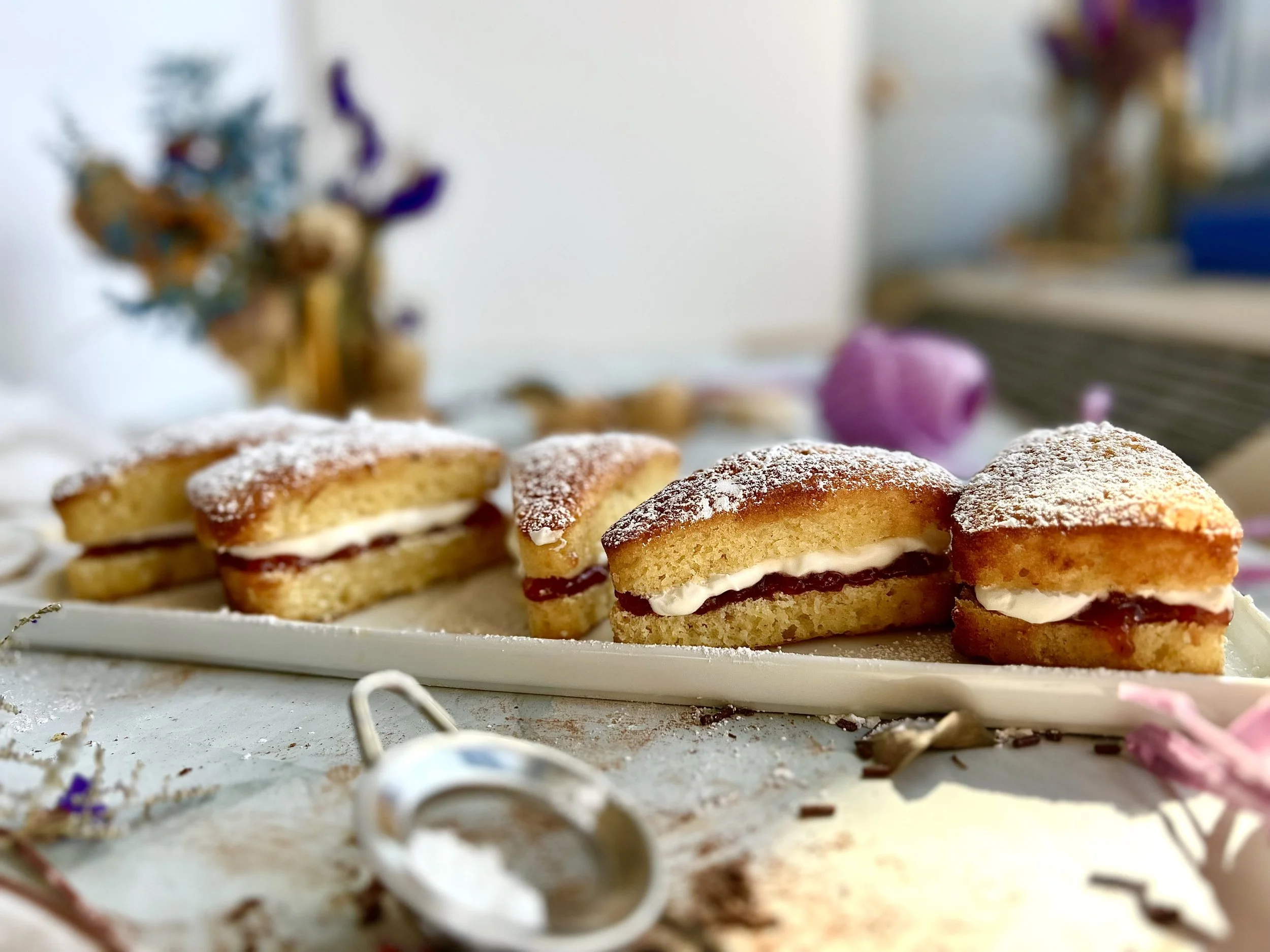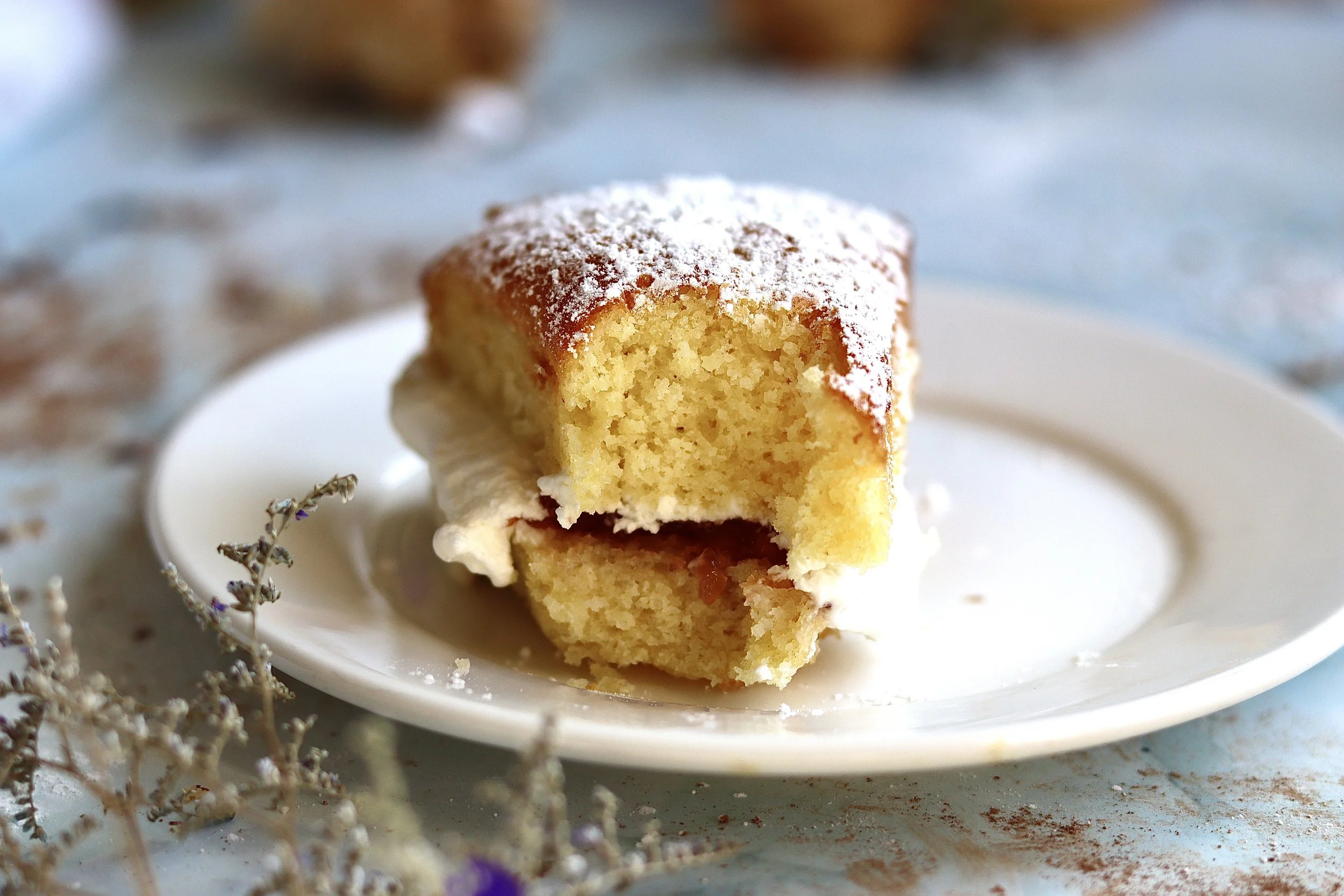 Using the spatula spread the jam across the slices. Next spread whipping cream over the jam leaving about 1/4 inch to the corners. Place the other cake slice on top.