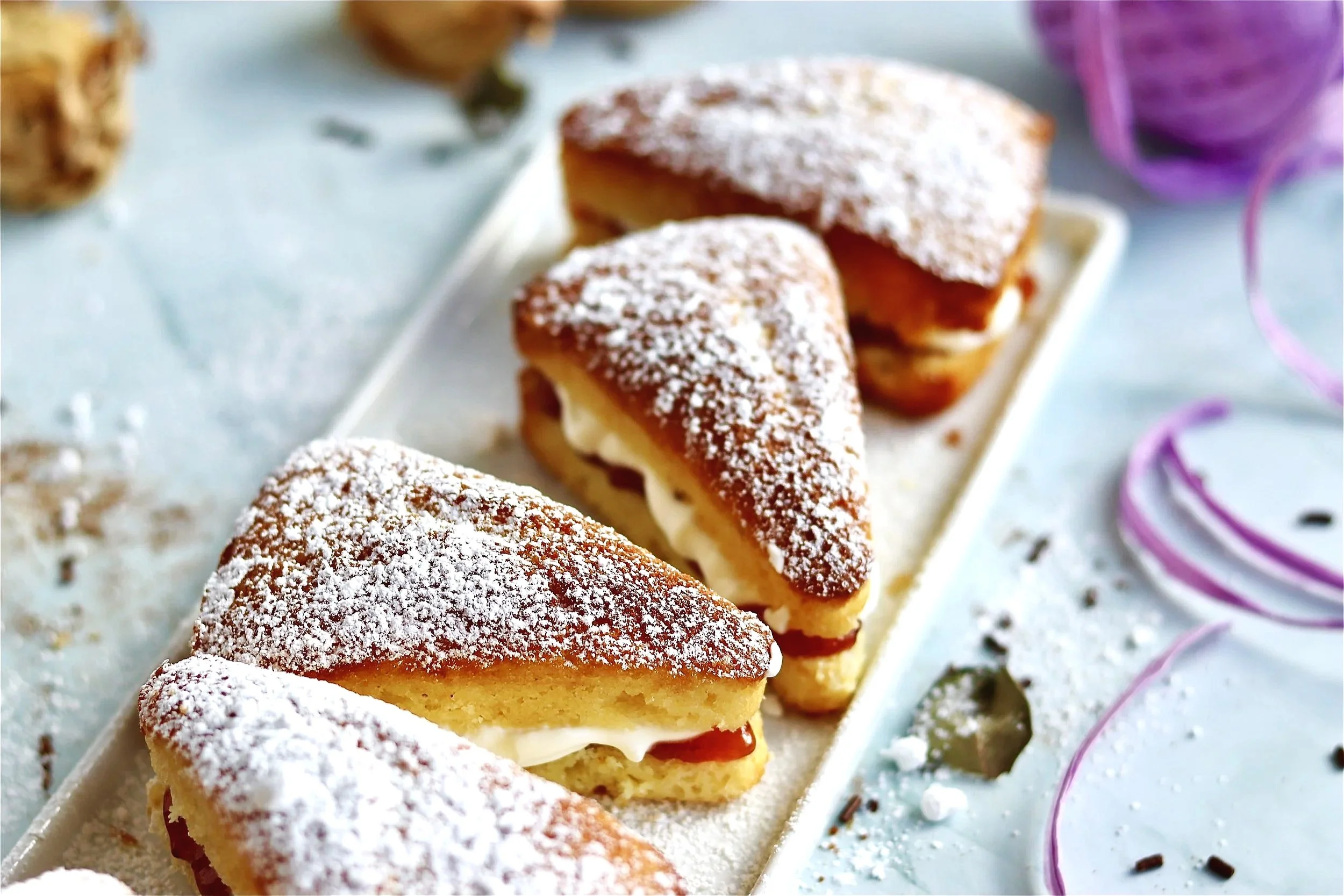 Using a sieve, sprinkle powdered sugar over the cake slices.